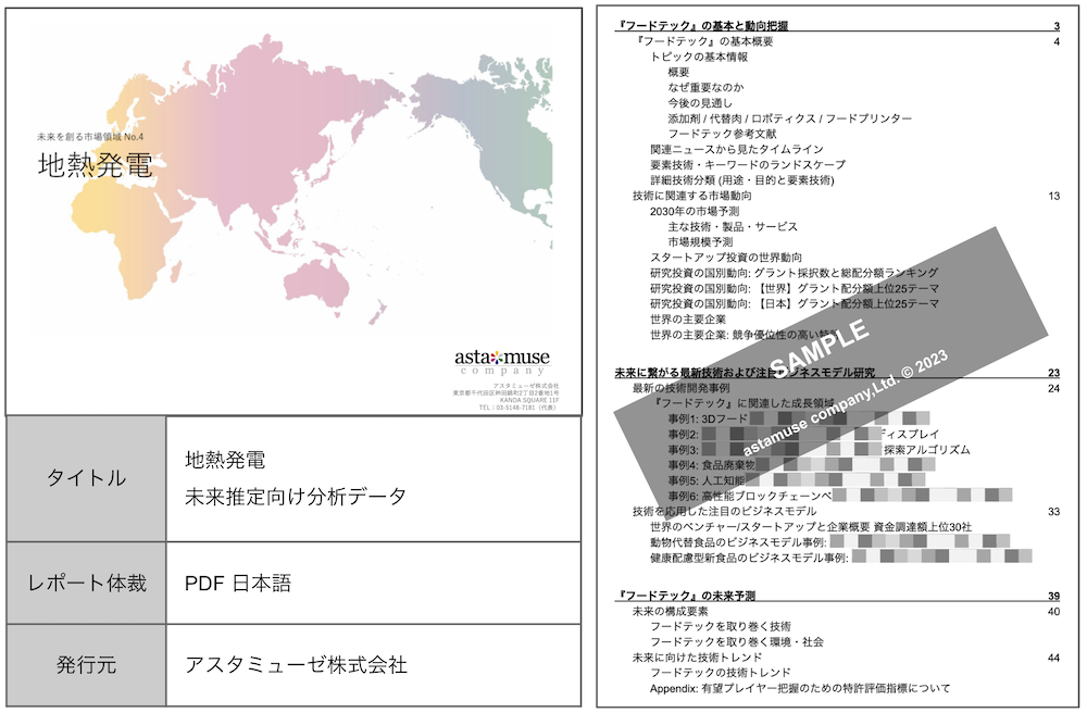 このために、国内第一線の知を結集して全世界の論文・特許、国内外の国際会議やシンポジウム、展示会等の情報並びに独自ネットワークによる口コミ情報を活用し、136 の有望成長市場と、40 の 未来技術を選んだ。主にビジネス視点で策定された有望成長 136 市場を対象にしており、本レポートは、『地熱発電』の未来推定に特化した内容となっている。