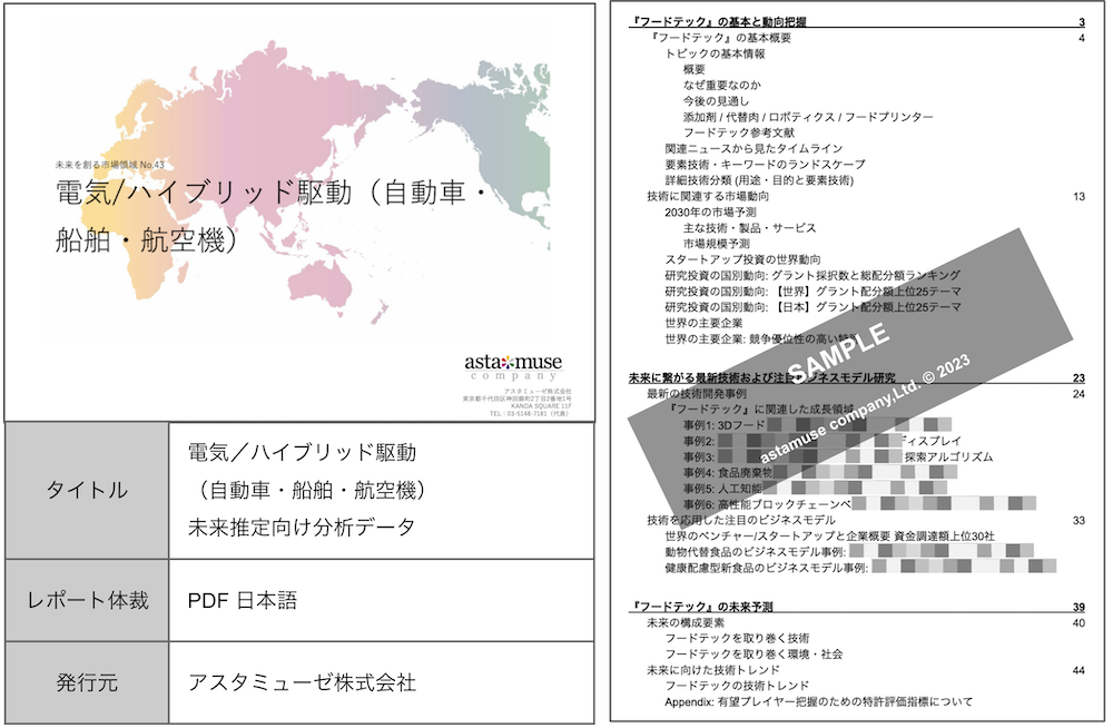 このために、国内第一線の知を結集して全世界の論文・特許、国内外の国際会議やシンポジウム、展示会等の情報並びに独自ネットワークによる口コミ情報を活用し、136 の有望成長市場と、40 の 未来技術を選んだ。主にビジネス視点で策定された有望成長 136 市場を対象にしており、本レポートは、『電気/ハイブリッド駆動(自動車・船舶・航空機)』の未来推定に特化した内容となっている。
