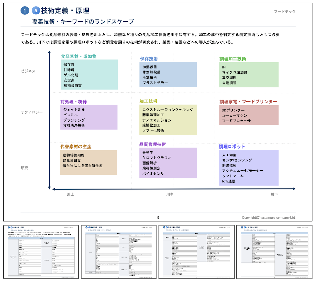 アスタミューゼでは今芽吹きつつある黎明期の技術シーズや今後 10 年から 20 年 のスパンで大きく開花すると期待される初動段階の技術市場に重点を置きつつ、生活文化の中に根 付く技術にも光を当て、総じて未来を創る技術分類の網羅に取り組んできた。