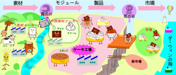 中間素材はモジュールに相当する部品です。ケーキ工場はこれらのモジュールを単純に組み立てて作るモジュラー型の工場と言えます。ただし、中間素材自体はたくさんの原料を複雑にすり合わせて作るインテグラル型です。サプライチェーン上の位置によっても変わってくるというところには注意が必要です。