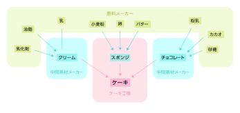 ホイップクリーム、チョコレートなどの材料は、小麦粉、砂糖、油脂などの大もとの材料と区別して中間素材と呼ばれることもあります。これらの素材がケーキ工場において部品に相当し、この部品を組み立ててケーキが作られているわけです。