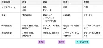 別の技術経営論では、要素を統合するときの複雑さに着目しています。サプライチェーンにおいて、原料や部品が製品に組み立てられる際の複雑さから産業の特徴が説明されています∗²。