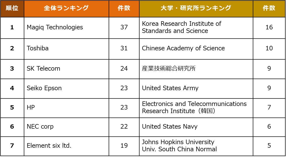 特許件数としては、量子暗号技術などを手掛けるMagiq Technologyが首位となっています。日本でも量子通信技術を中心に東芝、セイコーエプソン、NECなどの先行大手企業が上位に位置します。また、韓国のSK Telecomが、本領域における近年の韓国の躍進を牽引しています。また、センサー用途で最近注目される窒素空孔(N-Vセンタ)ダイヤモンド材料の技術は、ダイヤモンドを扱う最大手企業のDeBeers参加の合成ダイヤモンド企業であり、特許の質・量ともに高い水準にあり、センサー用途のダイヤモンド材料を提供する次期有力プレイヤーとなる可能性が高いと言えます。また、研究所や大学からの出願としては、韓国の躍進を研究側から牽引する韓国標準科学研究所が最も多く、次いで中国科学技術アカデミーが位置していますが、日本の産業技術総合研究所においても量子通信関連のセンシング技術やダイヤモンドを用いたセンサーなどの技術で出願数は多くの出願があります。米国の陸軍および海軍の研究所においても量子暗号や量子イメージング用途のセンサー技術が出願されています。大学個別として米国や中国の大学が上位にランクインしていますが、数としては少なく、まだまだ出願数としても日本が優位に立てる可能性が十分あるため、出願ポートフォリオ戦略を明確にしてある程度の束での出願が、今後の本領域での主権を握るという点でも重要と考えられます。