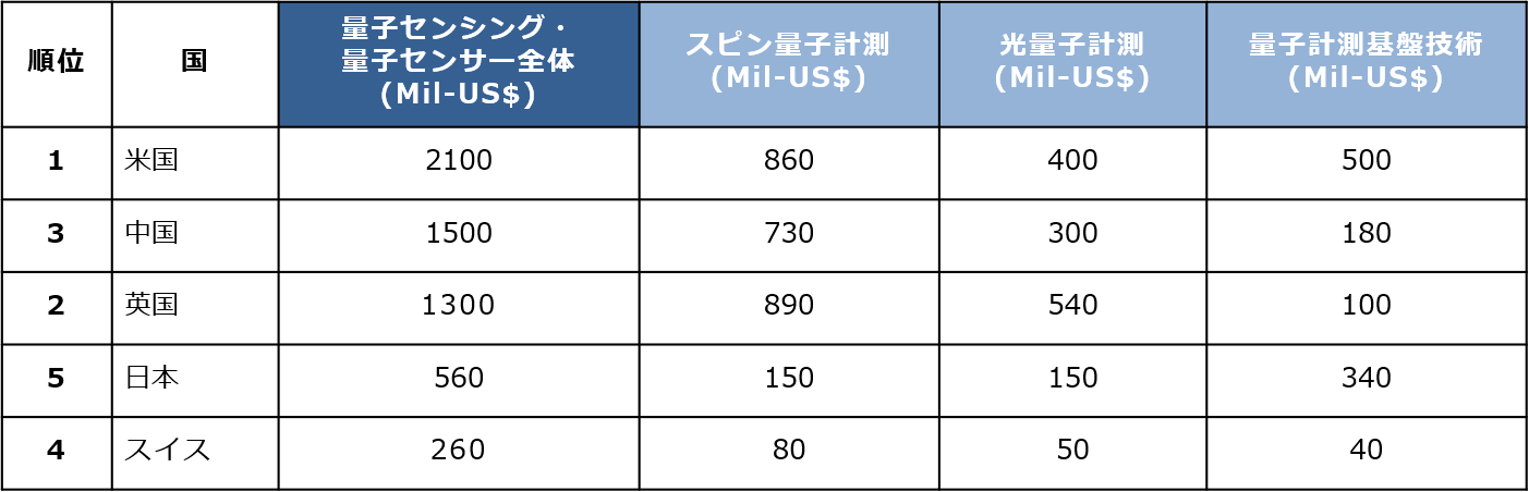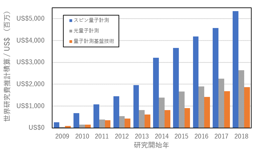量子計測基盤技術は、量子自体を計測するための基盤的な技術領域であり、高度な計測機器・装置を要する大規模設備が必要な基礎研究領域です。したがって、大規模な研究投資を基礎研究に対して行っている米国での投資が優位にあります。また、基礎研究に対しては日本も多くの研究予算を充当してきた背景があり、世界で620研究テーマではありますが、引き続き定常的な投資により人材育成と量子技術のさらなる研鑽が必要です。また、基礎研究での共同研究に企業も参入することで、量子コンピュータ・量子ネットワーク以外の用途として開拓される新奇の量子系の特性を早い段階から把握して自社技術化することで、用途開発を世界に先駆けて取り組むことができるため、企業とアカデミアの共同開発が重要な領域でもあります。比較的応用への障壁が低い量子センサーにおいては、基礎研究からの新規量子系の応用開発が直接出てくる可能性を英国などでは期待して産学連携体制の構築を加速しています。