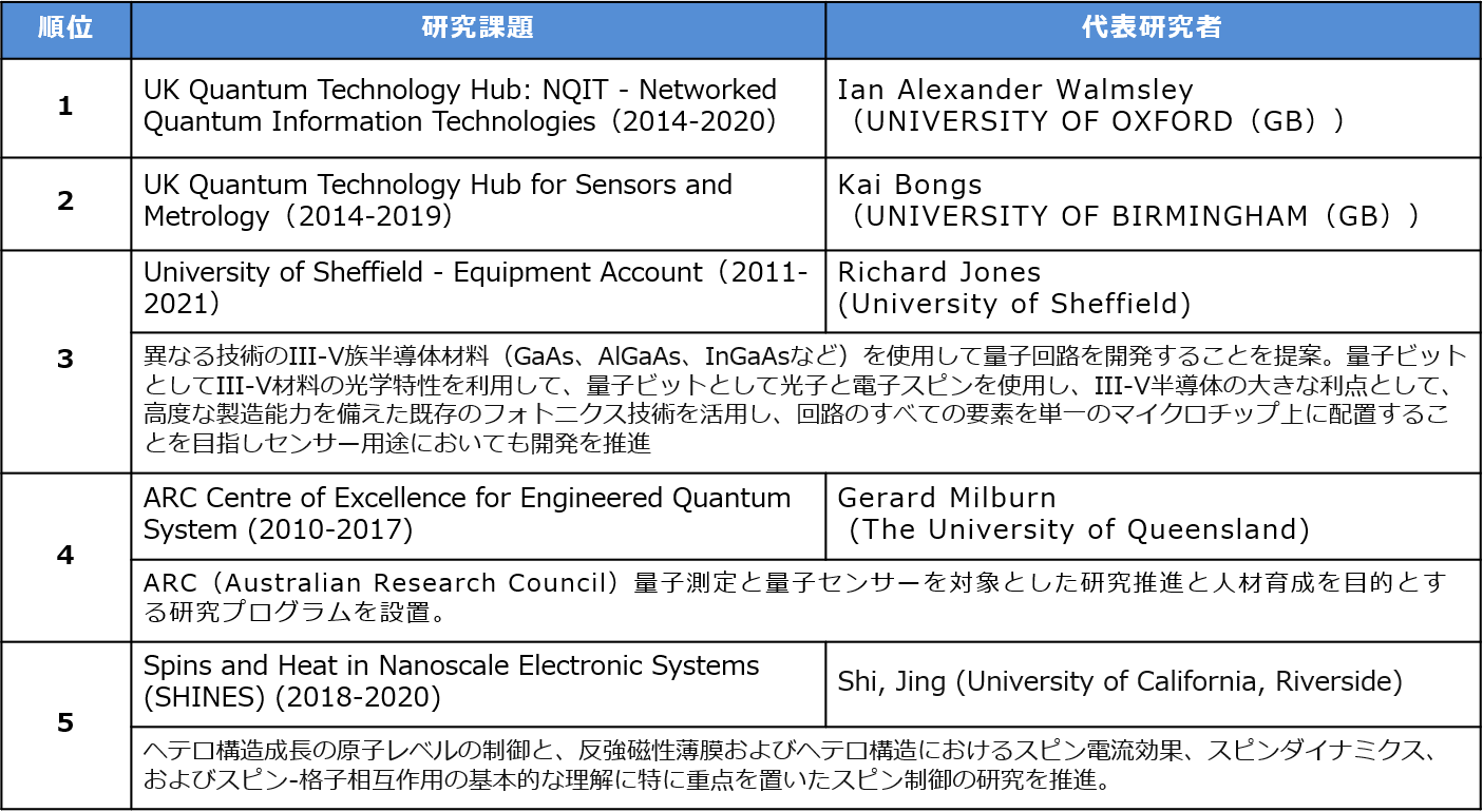 (1)「スピン量子計測」グラント資金流入上位5研究内容