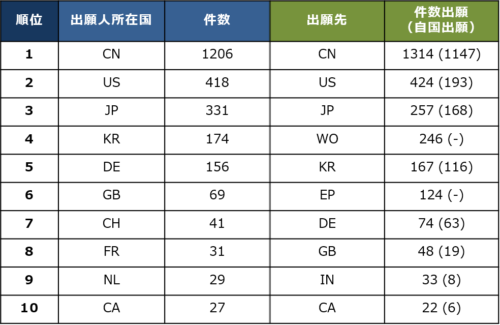 以下に「量子センシング・量子センサー全体」の特許出願動向について、関連特許56か国、WO、EPでの出願特許、2792件より集計した結果を、出願数上位の国および機関(グローバル)について示しました。出願人・譲受人の国としては、中国からの出願が圧倒的に多い状況で、量子技術でしのぎを削る米国、英国は比較して大きな優位性をとれてない状況です。また日本でも特に大手企業を中心に出願が先行していますが近年は減少傾向です。一方、近年では韓国からの出願が増加しており、米国からの出願と同程度の水準に達してきています。出願先の国としては、中国が圧倒的な中で米国も比較的多いですが、中国を含め国内出願とWOへの出願が多いフェーズです。今後、具体的な市場が立ち上がる段階で、国際出願への移行が増えてくる可能性があります。自国ではない企業が出願する国際出願の件数としては、米国への場合が最も多く、中国への場合も拮抗しており、また同程度のWOへの出願があります。一方で、日本からの出願は量子コンピュータ技術同様に、2010年くらいまでは世界トップクラスの出願数でしたが、近年は韓国の出願が増える一方で、日本は年々減少傾向にあります。
