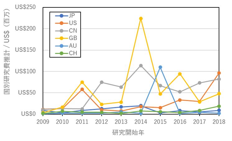 量子通信・量子暗号・量子中継・量子ネットワーク領域への未来技術開発に対する投資額として国費からの支出である世界の研究費(グラント)の2009年以降の推移を示しました。