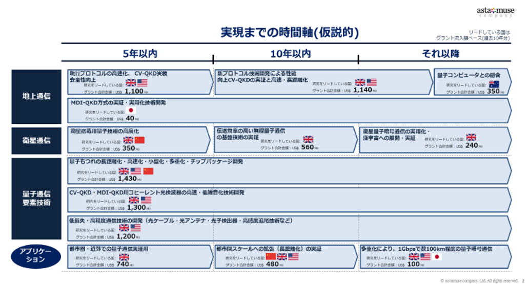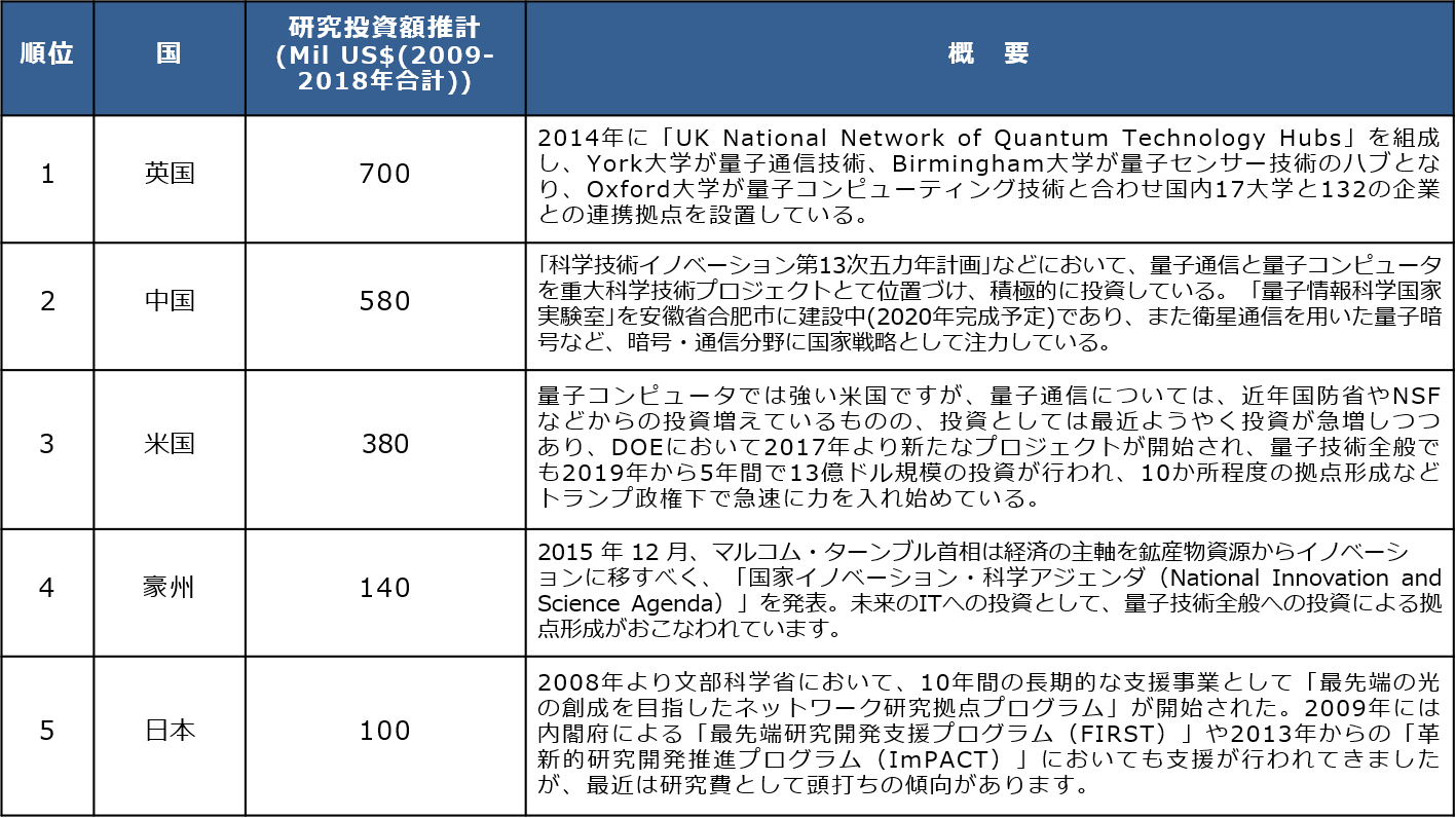 量子通信・量子暗号・量子中継・量子ネットワーク領域における主要な国の研究開発費とロードマップ