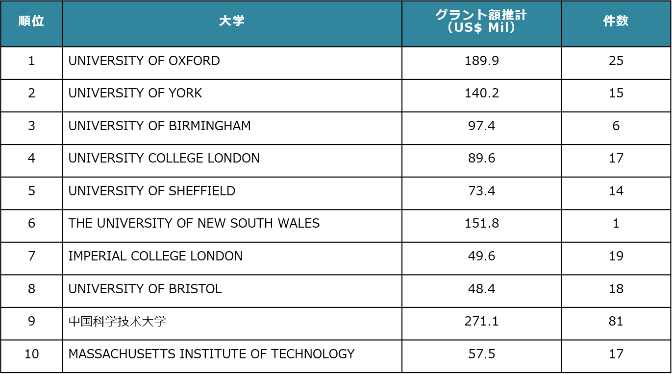 「量子通信・量子暗号・量子中継・量子ネットワーク」グラント資金流入額上位10機関(世界)