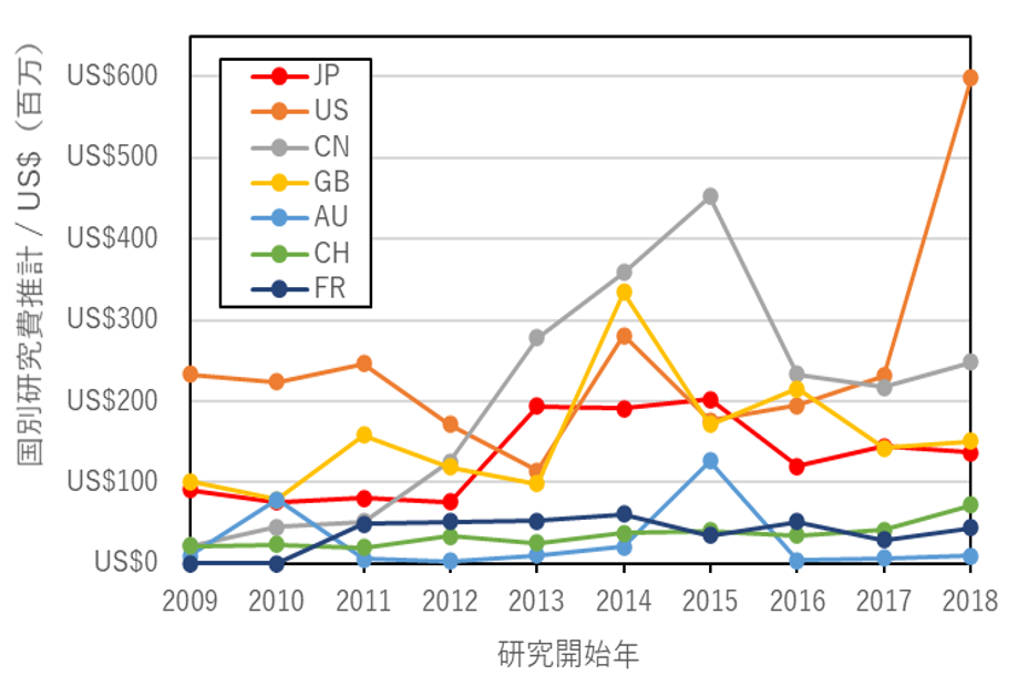 この量子材料・量子科学理論・量子生命科学・量子派生技術領域への未来技術開発に対する投資額として国費からの支出である世界の研究費(グラント)の2009年以降の推移を示しました。材料およびデバイス領域の開発が中心であるこの領域は、量子コンピュータや量子ネットワークの投資が大きな国を中心に投資額としても大きいですが、計算科学やセンシングなど量子技術全般への波及効果が高い基礎技術である量子材料技術への研究投資を軸としながら、応用が比較的早いとされるセンサー・センシング領域には量子コンピュータや量子通信よりも大きな研究グラントの投資が進んでおり、量子材料の基盤技術での進展とともに、量子コンピュータ・量子通信の技術や、より高精度・高安定性の量子センサー開発が進展すると考えられます。また、量子派生技術の中でも、特に量子センサー・量子センシング分野については社会へ実装される応用面でも早期の実用化の可能性が高く、応用面を中心にした投資が今後も加速すると期待されます。