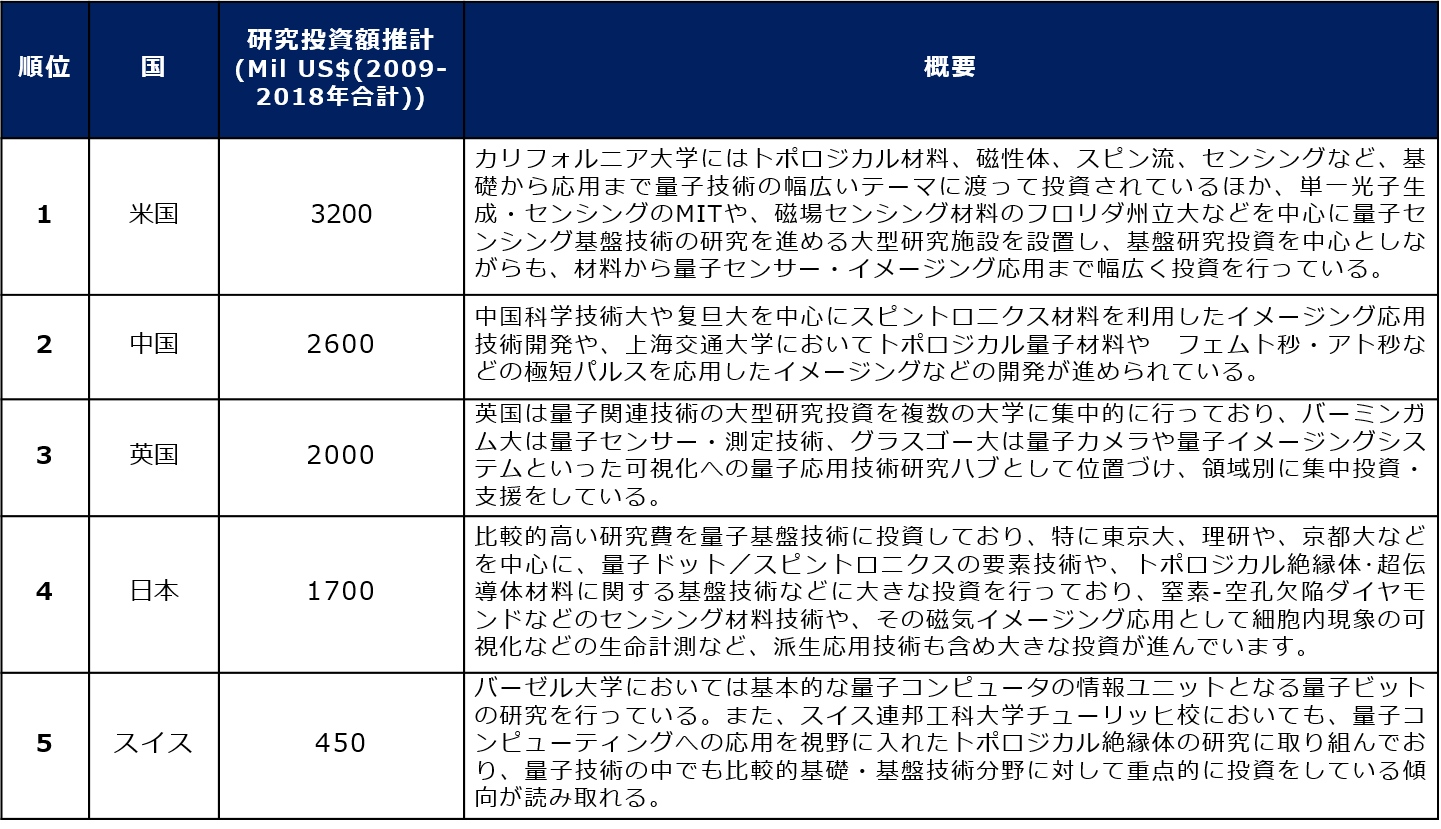 日本では、比較的高い研究費を量子基盤技術に投資しており、特に東京大、理研や、京都大などを中心に、量子ドット/スピントロ二クスの要素技術や、フェムト秒アト秒レーザー開発、トポロジカル絶縁体・超伝導体に関する基盤技術などに大きな投資を行っているほか、最近では窒素-空孔欠陥ダイヤモンドを用いたセンシング材料技術を中心に投資がなされており、量子コンピュータ・量子通信関連技術で先行する東京大、理研、大阪大、京都大、筑波大などへの基盤技術への投資が多い状況です。一方、量子センシングで注目される領域の生物や地球科学への応用に関連する研究投資があまり見られない状況にあります。