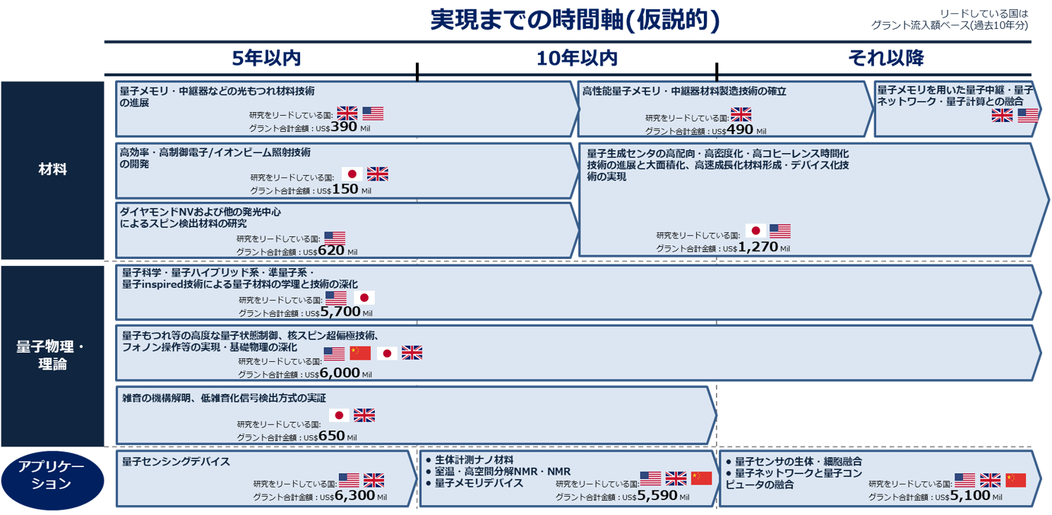 量子材料センサー科学理論・量子生命科学・量子派生技術領域における主要な国の研究開発費とロードマップ