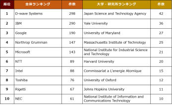特許件数としては、D-WaveやIBM、Google、Microsoftなどの大手米国企業および、日本もNTTや東芝、NECなどの先行大手企業が上位に位置します。また、研究所や大学からの出願としては、知財譲り受け制度にともないJSTに帰属する特許が世界的に最上位に位置しているため、これらの知財の活用が日本の存在感の確立には重要と考えられます。大学個別としては米国の大学や英国の大学が上位にランクインしています。
