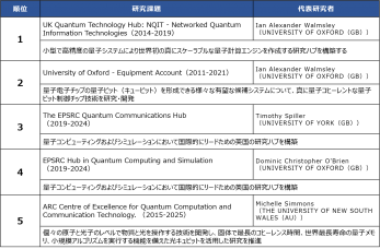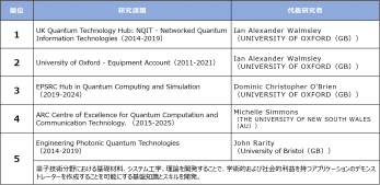 研究資金(グラント)において、量子コンピュータ・量子アニーリング・量子ソフトウェア・量子AI全体では、ノイズ耐性の高い量子コンピュータおよび、その多ビット化・集積化を目指した基礎研究および、旧来の半導体を用いた超電導回路の形成などデバイスを実現できるスケーラブルなデバイス製造関連が大規模な設備を必要とする研究のため、多くの研究費を投入して英国、米国、中国の三つ巴の研究開発競争の状況にあります。特に、量子コンピュータは誤り訂正と、現状のNISQ、量子アニーリングマシンの活用方を並行で開発し、かつ人材育成や産業活用についてコミュニティ形成を含めて進める目的で大規模な研究センター、研究ハブの設置が英国・豪州を中心に進めており個別研究費の上位はこのような研究に対しての投資です。