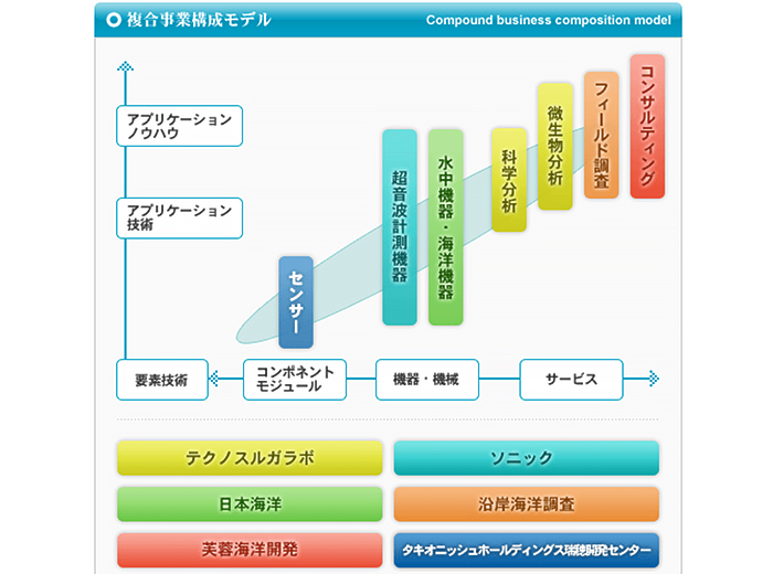 私は、日本は「海洋産業後進国」だと思っています。魚を獲ることは上手ですが、こと海洋資源に関しては欧米の先進国に大きく後れを取っていると思っています。だから海外から学ぶしかないわけで、海外から良い商品を持ってきて国内に普及させようと。それで輸入商社を持ちました(日本海洋株式会社)。学んだ分を実現するためにメーカー機能を持っていないと、ということでメーカー機能も持ちました(株式会社ソニック)。このメーカーで開発した商品や、輸入した商品が使えるかどうかを評価できるフィールドを持つ必要を感じて企業を組み入れ(海洋エンジニアリング株式会社。旧:芙蓉海洋開発株式会社)、調査できる企業もグループに入れました(沿岸海洋調査株式会社)。また、メーカー機能を実現するには様々な技術が必要なので、必要な無線技術を持つ会社も傘下に収めています(日生技研株式会社)。