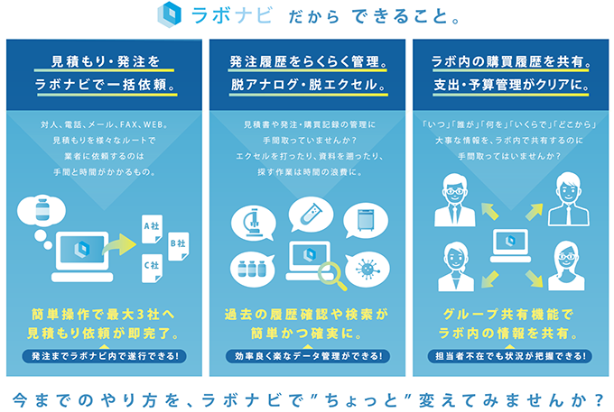 はい、まず冒頭にお話しした「研究業界を盛り上げる3つの柱」ですが、当然購買の仕組みをSaaSでスムーズ化した「ラボナビ」だけで実現できるとは考えていません。