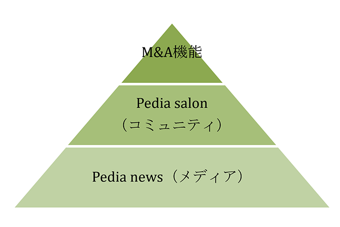 pediaはシリアルアントレプレナー(シリアルアントレプレナー)のためのメディア「pedia news」とコミュニティ「pedia salon」があり、ここにM&A機能が繋がるとシリアルアントレプレナーさんにとって理想的なピラミッド状態になると考えました。