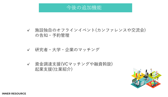 あとは、起業支援としていろんな仕業とのマッチング、資金調達支援としてVCとのマッチング、勉強会や交流会などオフラインイベントのPRや予約管理など順次機能を追加していきます。
