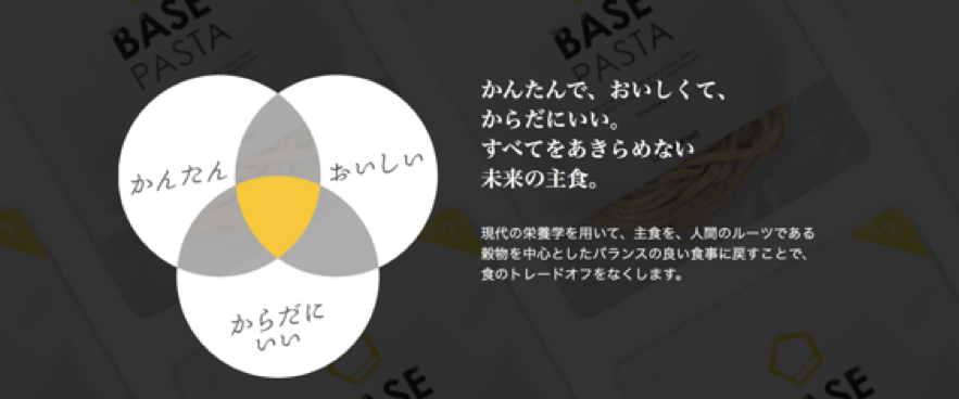 「『健康を当たり前』にすることをミッションとして、1食で1日に必要な栄養素の3分の1を摂ることができる生パスタ『BASE PASTA』を提供しています。『健康を当たり前』にしたいと思った理由が2つあり、ひとつは日々の生活の中で十分な栄養を摂るのが難しいという問題意識からです。自炊をした方が良いのか、自炊するとして一体何を食べれば良いのか。そもそも忙しいと自炊もできなかったりと、栄養って難しいなと、ずっと思っていました。