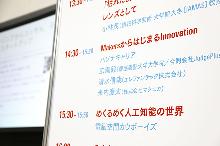 初日、会場のセンターステージ(西2ホール)で行われたのは、パソナキャリアが主催するプレゼンテーション「MakersからはじまるInnovation」。慶應義塾大学大学院 システムデザイン・マネジメント研究科 特任助教の広瀬毅(つよし)氏による講演(第1部)、エレファンテックの代表取締役社長 清水信哉氏、マクニカ Mpression推進部 部長の米内(よない)慶太氏をゲストに迎えたパネルディスカッション(第2部)、2つのプログラムの様子をお伝えします。